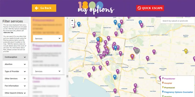 The application is also used by the 1800 My Options team to assist women who contact the service to locate service providers that most closely meet their specific reproductive health requirements.